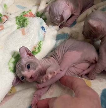 Description of what you think the perfect kitten would be. Example: Female (or male) Sphynx (or Bambino, Elf or Dwelf) solid black (or preferred color), super cuddly personality (or super playful, or a balance of both). Clients are not limited by these choices, and will be presented with all available kittens. The personality trait can be tailored on how we raise them. For a super cuddly kitten, we spend weeks with the kitten tucked in our shirt, held in a pocket, or nuzzled on our chest. For a more high energy kitten, we spend endless days playing with wand, handheld toys. Our goal is to not only provide a visually beautiful kitten, but one that has the preferred personality.